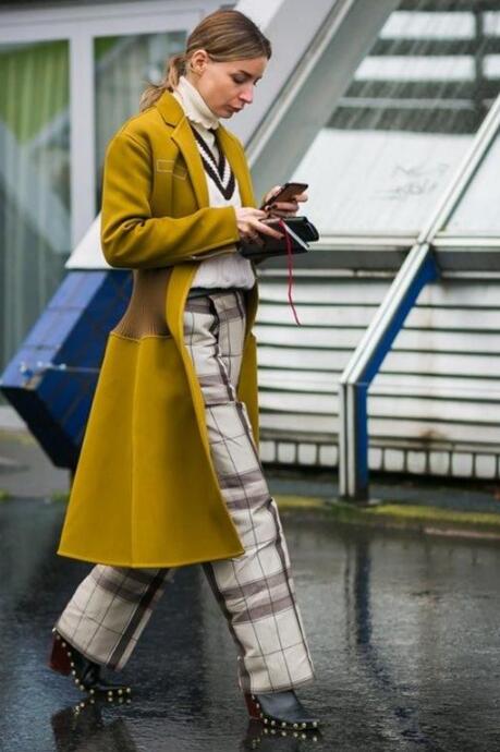 要说今冬的标配是什么?选择姜黄色大衣+格纹阔腿裤,尽显知性女人味,潇洒中带有一丝自信。get白色小高领,以及v领毛衣,将它们塞进格纹阔腿裤里,不仅打造出高腰线,更是时髦度依旧不减,美得很出众。脚上搭配黑色短靴,打造大气随性范,你心动了吗?