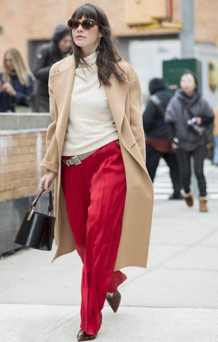 这个冬季怎么能少了显气质的驼色呢?选择驼色大衣+红色阔腿裤,洒脱中带有一丝高贵,拯救你不完美的身材。pick米白色高领毛衣,以及棕色高跟鞋,隐藏不住的清新淡雅气息,让人眼前一亮,打造典雅女神范,气场十足!