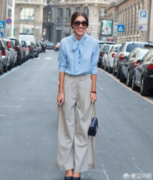 首先,阔腿裤在时装中还是更加偏向于OL风格的,所以千万不能为了迎合夏天活泼的气氛就随意去选择一些颜色跳跃的裤子,看起来没有质感不说,还会让人的视线集中在腿上,很难显得腿长,颜色方面还是以白色、或者是雾霾灰、雾霾粉这种饱和度比较低的颜色,才能显得下半身轻快一些。