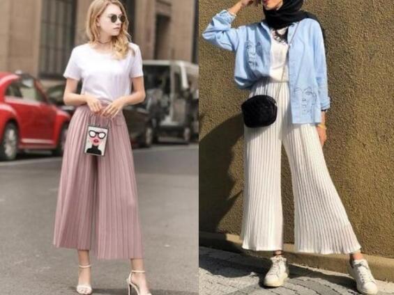 如同百褶裙的飘逸灵动,百褶款的阔腿裤也是别有一番风情。站立时,如同一条百褶裙,低垂飘洒,一旦走动起来,百褶摇摆灵动,既有裙裤的洒脱,又有百褶裙的飘逸优雅,搭配衬衣、T恤,休闲范儿或者摩登装扮,都毫无违和感。