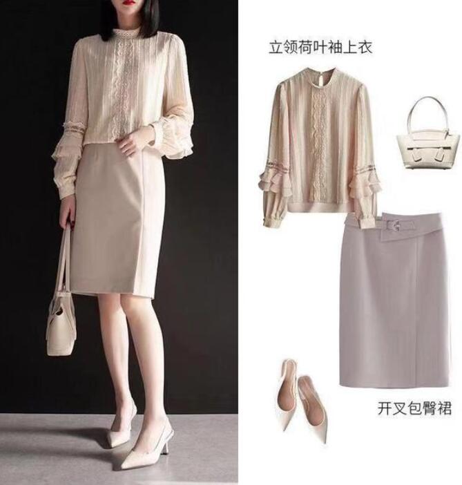 挑选一条开叉的包臀裙进行搭配,使你看起来温柔无比,更能够展示出你的气质感,选择同色系的包包和鞋子进行搭配,能够看上去更加协调。