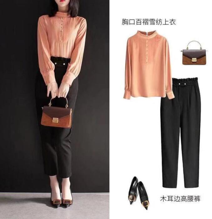 选择一件淡橙色的胸口百褶雪纺上衣,可以展示出你的女人味。配上一条木耳边的高腰裤,能够更好的提升你的腰线,身材更有优势,搭配一双高跟鞋更显腿长。