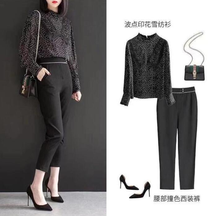 我们可以挑选一件波点的雪纺衬衫,更好的展示出你的女人味,让你看起来更加优雅。建议大家搭配一条撞色的西装裤,能够让你看上去更加知性。