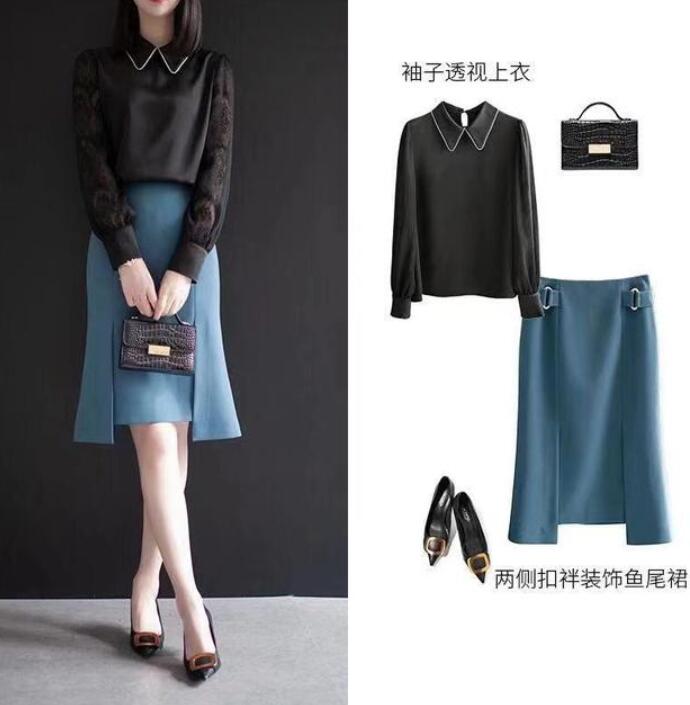 一件黑色衬衫更能够展示出你的性感和优雅,使你看起来知性风十足。一条蓝色的鱼尾裙,展示出你的身线。造型看上去更有魅力。