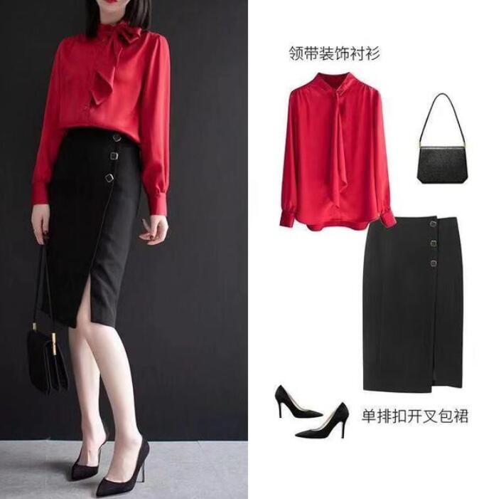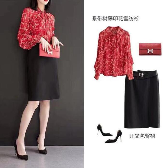 觉得纯红色太过于单调的话,那么我们可以挑选一件系带的树藤印花红色雪纺衬衫,搭配一条开叉的包臀裙。
