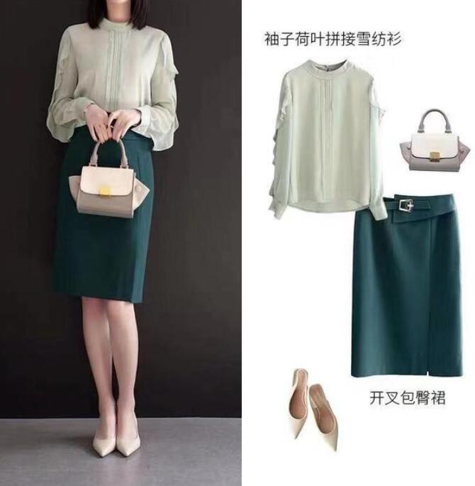 这套和上一套的风格一样,只是色彩上的区别,绿色更有清新感。袖子荷叶拼接雪纺衫展示出你的仙气翩翩,搭配一条深绿色的开叉包臀裙能够展示出你的个性。