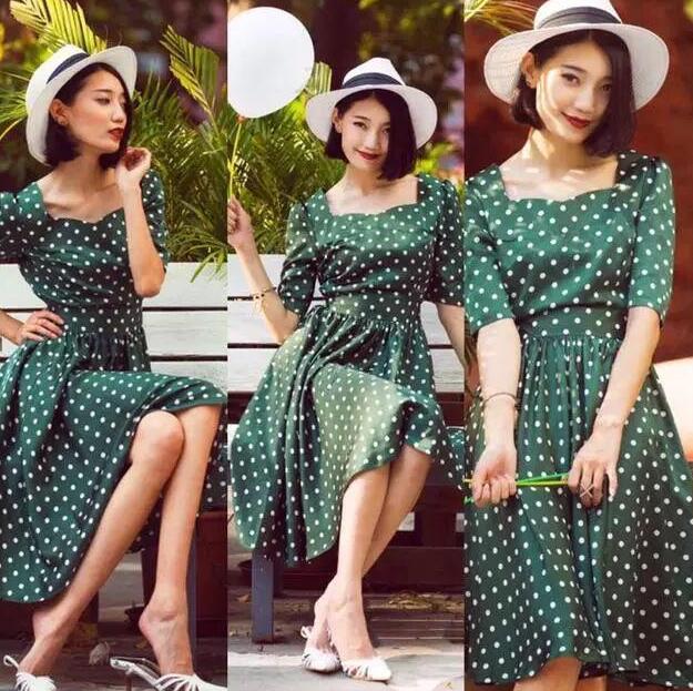 这是一条极具女人味的连衣裙,复古的暗绿色搭配白色的印花,让裙子看起来充满了优雅的气息,这个颜色还特别的衬托肤色白皙,搭配上一双红色的玛丽珍单鞋,让复古味更加浓郁。绿色连衣裙搭配图片
