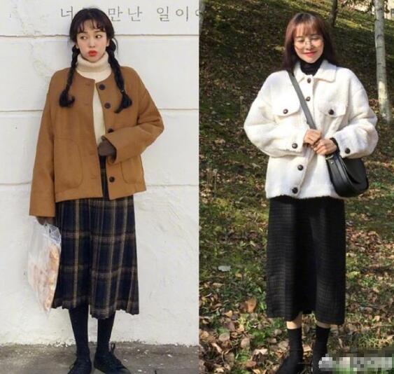 短款外套+裙子,清爽又显高,特别适合小个子的女生,比如格纹半裙+米色高领毛衣,搭配棕色短款小外套,减龄又可爱。