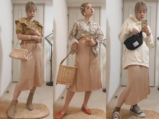 裙装是一件好看的淡橘色半身长裙,淡淡的橘色是温柔可人的颜色。日系小姐姐的穿搭很多都是类似这种的,个性比较强烈、明显,同时也让自己变得好看了起来。