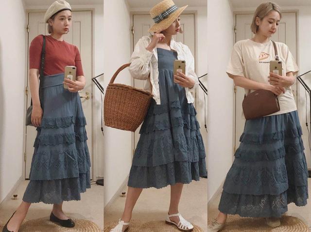 蛋糕裙是雾霾蓝的颜色,比较的深沉和成熟,但是在日系风格搭配中却是比较常见的一款。一层一层的蕾丝面料让这件裙子多了梦幻感和浪漫的气息。