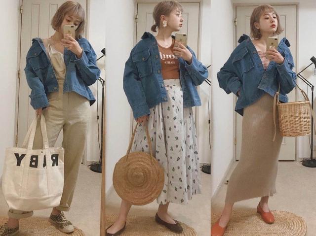 蓝色牛仔外套也是日系穿搭中比较常用的外套单品,它给予女人更多的是一种古典美和气质美。外套内搭一件咖色的字母T恤,简简单单却好看到极点。