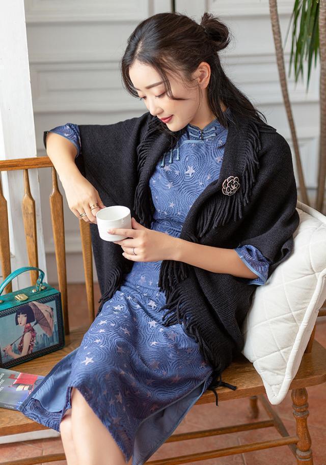 旗袍与披肩是一对“孪生姐妹”,中西合璧的搭配美学,是一种品位搭配时尚的格调。星星印花的蓝色旗袍装,充满了浪漫淑女的情怀,立体的纹理动感十足,泛着涟漪,优雅又清新减龄,搭配一件毛呢的斗篷披肩,散发出高贵典雅的气质,挡不住的文艺知性魅力。
