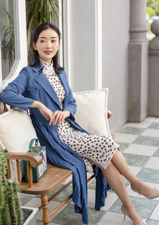 旗袍的复古优雅,与针织开衫的温暖娴静完美融合,一直以来都是完美的搭配,将东方女人的端庄温婉展现得淋漓尽致。蓝色的旗袍盈逸柔美,修饰着婀娜的身材曲线,领口的网纱透出一丝性感,立领点缀盘扣,雅致高贵,搭配针织绣花的开衫,瞬间定格了整体的气场,端庄清丽。