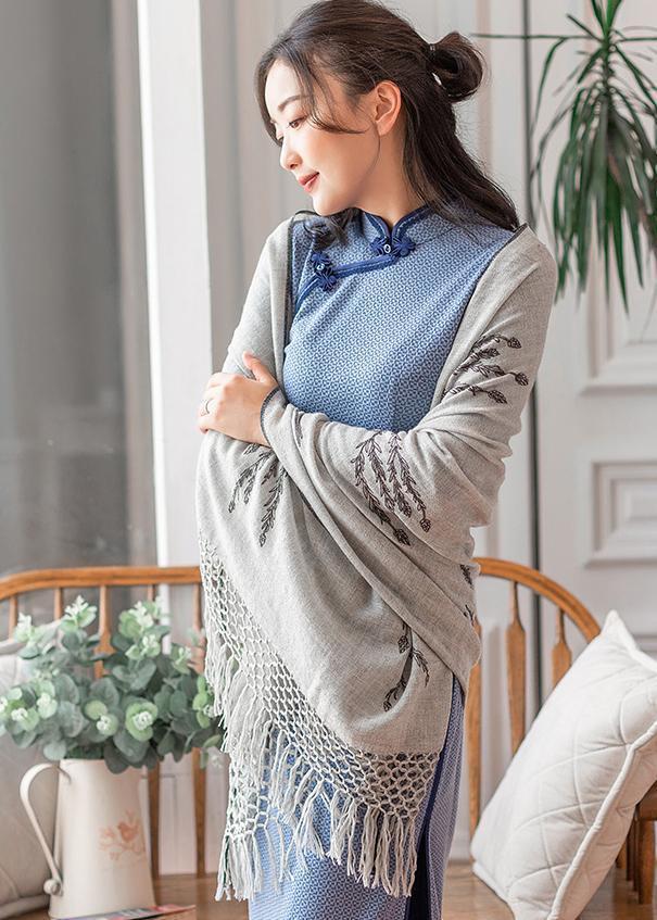 阑额的旗袍素净典雅,不沾染一丝浮华,静谧的蓝调浸染了岁月的唯美,细腻的雪花纹古朴里充满了别样的恬静味道,触落了一地的浅香记忆,立领点缀盘扣,精美的包边勾勒,柔婉娇媚,搭配灰色的针织披肩,古典而迷离的气息,在空气中摇曳生姿,恰到好处的悄然婉约。