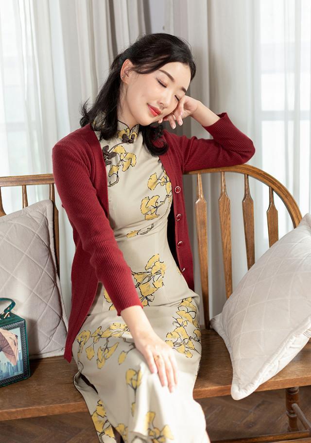 温润的米黄色旗袍装,深情又恬静的女人味,银杏叶飘落,沾染了秋的气息,一派文艺知性的风情,立领衔接着斜襟,精致的花扣点缀其上,更添灵动气息,搭配酒红色的针织开衫,不张扬不媚俗,优雅间弥漫着惬意与轻松,胜过浮华的千娇与百媚。