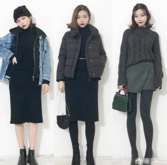 秋末初冬少不了黑色穿搭,黑色属于经典不过时的穿搭,黑色的高领毛衣+黑色针织裙,搭配牛仔外套,优雅的个性范,或者搭配黑色的羽绒服,同色系搭配,尽显高级。