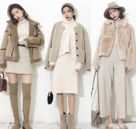 如果是小个子的女生,觉得长裤外套hold不住,短款外套则显高又干练,毛茸茸的杏色短款外套+米色针织阔腿裤,舒适保暖,白色针织半裙+白色高领毛衣+灰色羊毛外套,优雅显高。