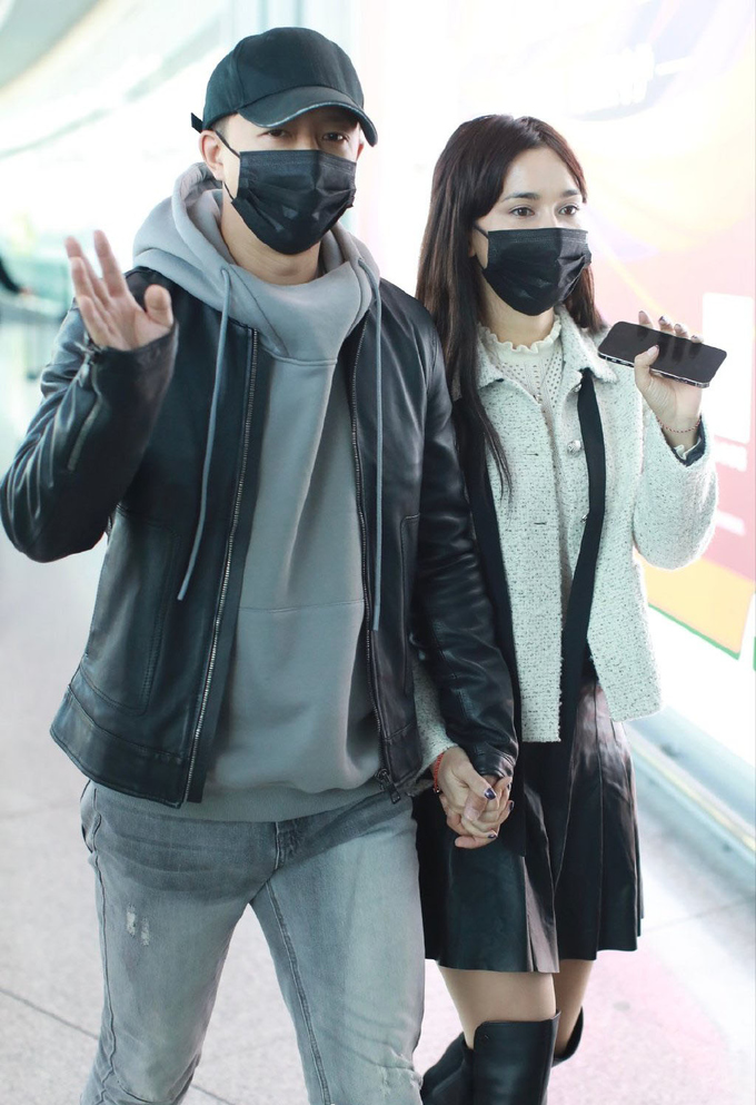 韩庚夫妇现身机场,卢靖姗穿短裙高筒靴化身小女生,一点不像35岁