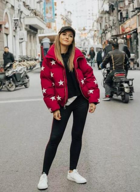 冬季必备的红色羽绒服在冬天里格外吸睛,洋溢着满满的热情。在红色上加入白色的星星图案点缀得恰到好处,可以显亮不少,暖和又洋气。选择黑色的内搭单品和黑色的裤子,和红色搭配起来格外吸睛,脚踩小白鞋可以提亮不少哦。