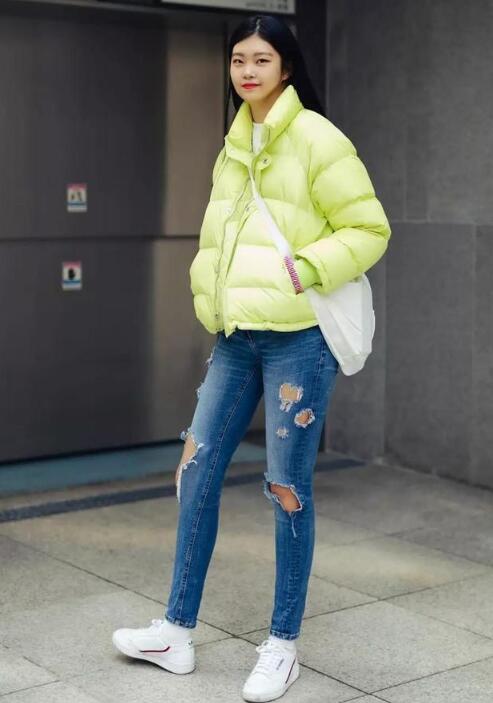 在冬天里遇见浅绿色羽绒服,暖和又洋气,真是让人心生欢喜。它的短款设计,更是彰显了满满的活泼感了,时尚与美貌轻松搞定。下半身get破洞牛仔裤,可以增加不少个性感呢。脚踩小白鞋,想没有青春活力都难。
