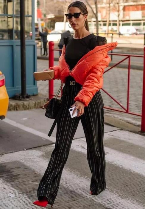 橙色羽绒服给人一种活泼的感觉,这种衣服不好好穿的方式,十分凹造型。小仙女可以选择黑色的内搭单品,可以非常显瘦。上装都是纯色,下装pick条纹元素的裤子来hold住,散发着独特的美感,时尚与美貌轻松搞定。
