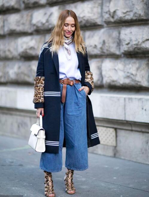 如果用单鞋搭配阔腿裤,建议选择九分长度的阔腿裤,稍稍露出一些脚踝,会显得比较高挑。上身搭配一件高领毛衣既有气质,又十分保暖。