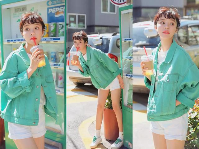 2019年流行的防晒外套,还有这件糖果色的哟,甜甜美美的一款,上身就给人一种甜美少女感,青春又减龄,内搭白色T恤和白色短裤,超级好看。