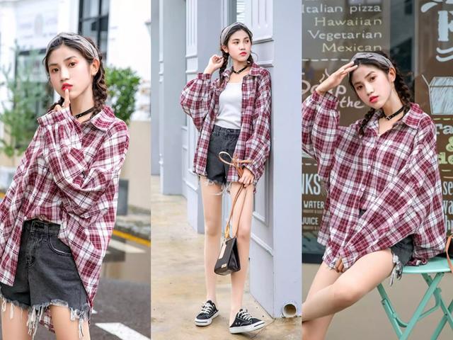 很实用的一款外套,是夏日防晒的必备,轻薄的材质,即便是炎热的天气,也不会闷热的哦,酒红色的格子,又是那么的显气质,还有种显白的小心机,比较宽松的版型,男装搭配,不挑身材,还显瘦藏肉,内搭白色T恤和牛仔短款,妥妥的青春少女风。