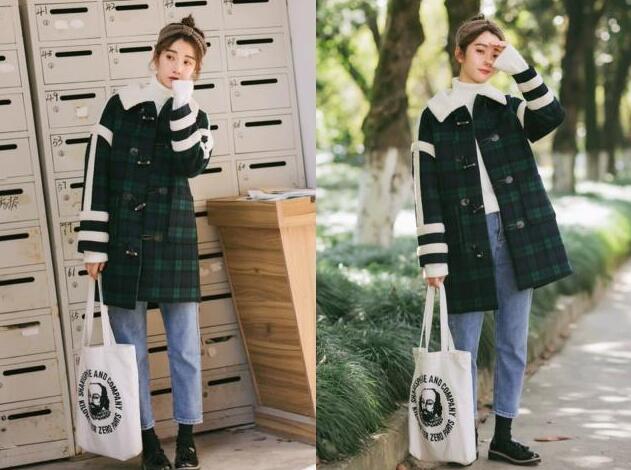 4、这款是属于墨绿色设计的格子元素羊羔毛外套,中长款的版型让你穿上就瞬间得到了温暖感,再也不用冬天里不够暖和了,很厚实的羊羔毛材质无论怎么穿都不会出错的,纽扣是牛角扣的设计又很个性的设计,整体看起来就比普通的大衣好看多了,并且还很暖和,喜欢的话可以考虑入手一件,美美哒上街。