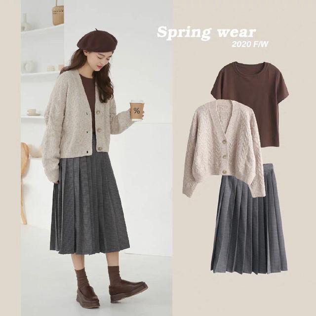 宽松感较好的开衫外套,是非常适合休闲风穿搭的了,这样的一件开衫外套时尚感十足。灰色作为中性色之一,本就备受好评。三粒扣的设计简约随性不失个人风格,内搭一件褐色短款T恤,两者搭配产生一种视觉上的饱和,让人十分舒服,裙装搭配一件亚麻面料的格子百褶裙,而且颜色也偏深,能更好的与其搭配起来。