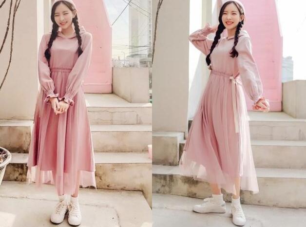 这款粉色高腰裙是属于高腰版型的设计,腰间配上一件腰带,让你的气质变得更加的优雅,连帽的设计随便怎么穿都很好看,袖子是收紧版型的设计,彰显出优雅的线条感,透露出甜美又显肤白,做工也是非常好的,裙摆处是网纱拼接的材质,很显女性的小性感,搭配休闲平底鞋,随便上街都美翻了。