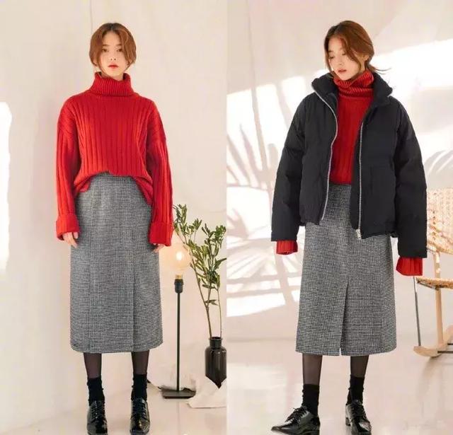4/高领毛衣在近几年可是时尚的宠儿哦,一件红色高领毛衣带着暖洋洋与喜庆的气质,让你妹子们时尚与保暖捡的,而红色可让皮肤白皙的妹子更加的显白哦,下半身搭配一款开叉长款包臀裙,包臀裙本身就是性感与成熟的化身,开叉的效果更惹人喜爱,外套可以选择一件黑色的棉服经典时尚,红与黑的组合十分的耐看,短款的效果更佳显高显气质哦。