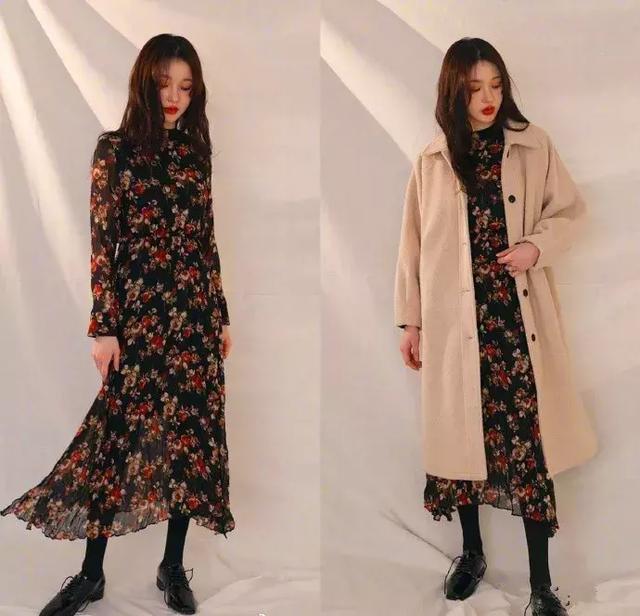 1/春夏十分常见的印花雪纺在冬天的时候你不必把它雪藏起来,一件黑色为底的印花雪纺连衣裙,带着一股淡淡的成熟的味道,作为内搭飘逸优雅十分有气质。外套的选择上,一件长款米白色毛呢大衣是不错的选择,大气时尚,内外都是长款让你走路都带着仙气。