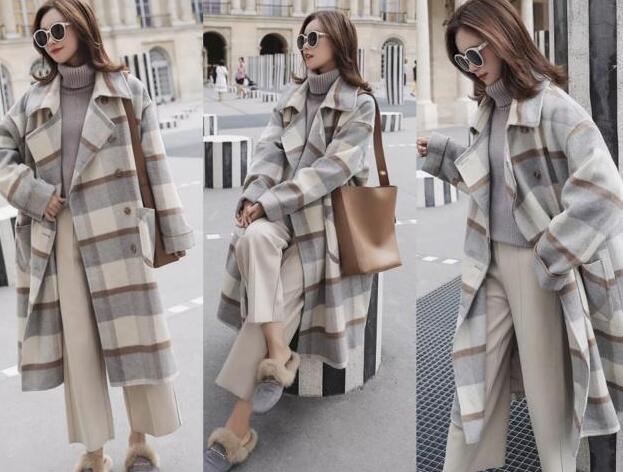 在过年聚会,大衣除了搭配毛衣裙外,搭配一条休闲裤出来的效果也是很棒的,喜欢休闲随性的妹子可以这样穿,这样的搭配舒适又好看,像这件格子的大衣搭配米色的阔腿裤就非常吸人眼球了!
