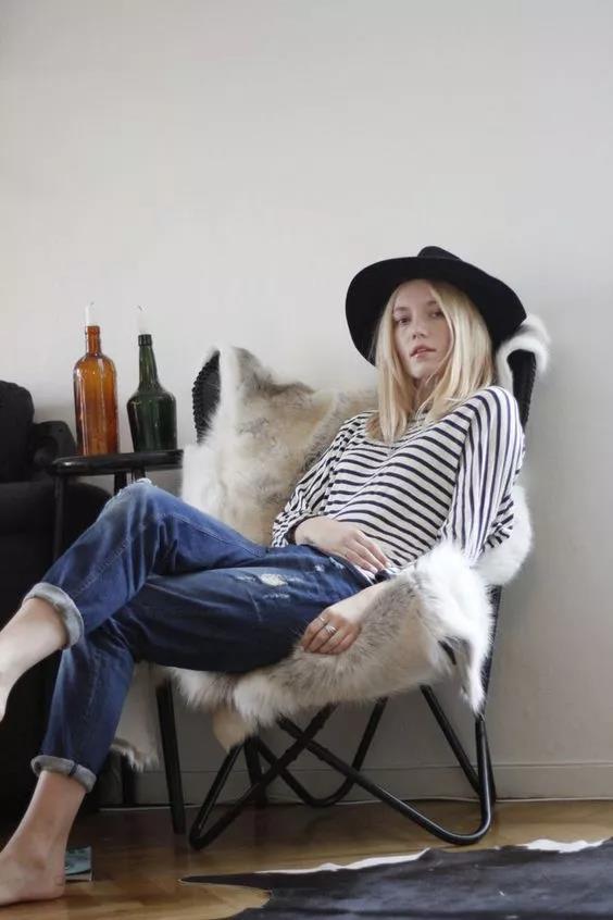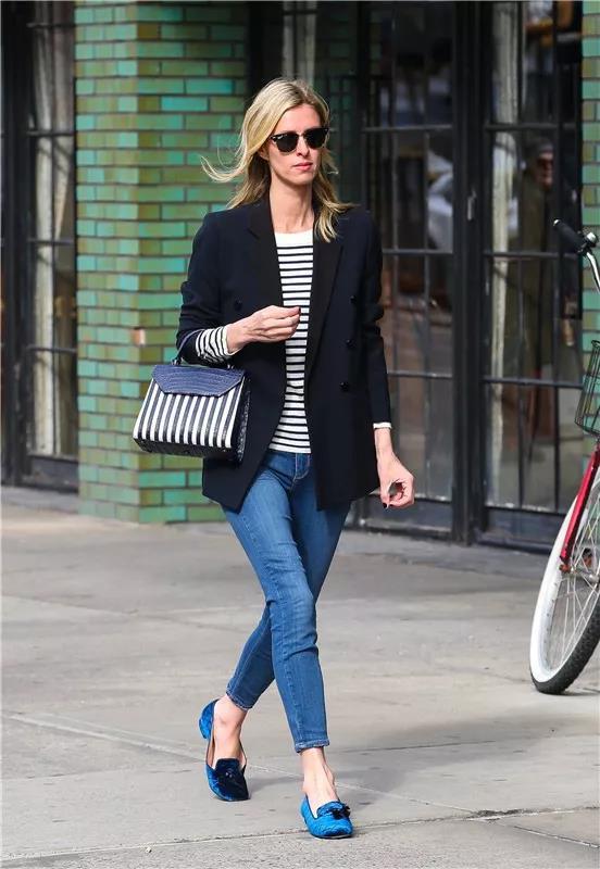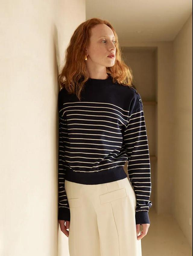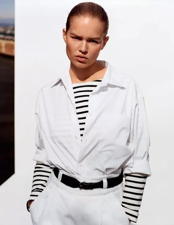 像黑白条纹的海魂衫,因为比较干净,简约,更加适合上班族,作为日常穿着也是不错的。像经典的蓝条纹海魂衫,可能对于黄皮的妹子就没有那么友好,黑白交错的海魂衫反而后来者居上,更能衬托肤色。 技巧二:选择不同宽度的条纹