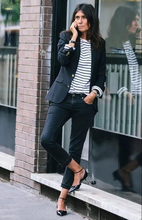 小编在这里建议小仙女们,在单穿海魂衫时,尽可能的掌控住上紧下松的穿搭原则,如果你是穿着紧身海魂衫,下身的搭配就尽量选择阔腿裤装显瘦又时髦,这样既不会显胖,还能能瞬间解决臃肿问题,干脆的黑白线条,还能让你变得气场十足。