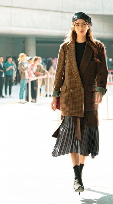 西装外套当然也是不能少得了,这次的小姐姐是选择了一件棕色的千鸟格西装外套,里面则是搭配了一件黑色的打底衫,下面则是搭配了银色的百褶半身裙,褶皱的元素可以让造型起到更好的遮肉的效果,男装搭配!而且几种颜色搭配在一起,也让造型更时尚不少了。女生换季不知道穿什么衣服?