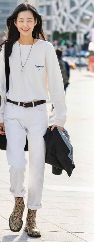 下面的小姐姐也是选择了用外套来保暖,不过正值中午的时候,外套已经脱下拿在手里,他选择的是一件西装外套,黑色跟蓝色拼接的外套,让造型可以更时尚不少了,里面则是选择了一身白色的搭配,上面是一件白色的卫衣,卫衣上只有简单的logo设计,让造型不会过于单调了,下面的裤子同样是选择了白色,不过在腰间的位置上设计了黑色的腰带,可以让造型的腰线可以更明显几分,脚上的鞋子选择了蛇纹的靴子,给整个白色的造型增加了一分色彩,让造型更多元化。