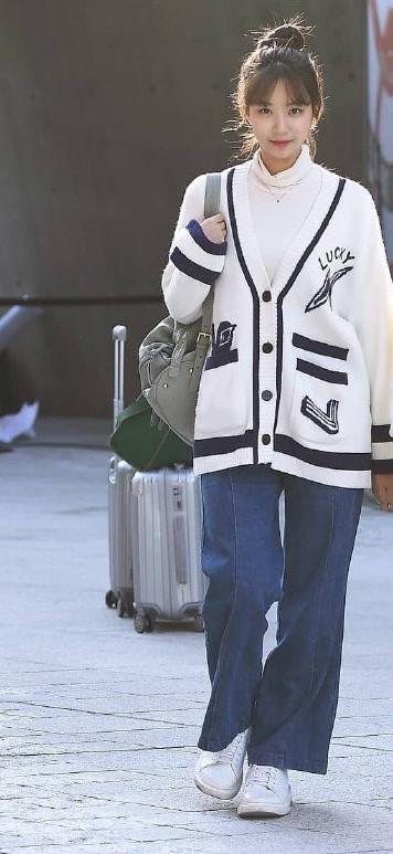 毛衣在我们进入秋天以后也是很常见的了,这次的小姐姐就选择了用毛衣来搭配,不过里面选择的是一件白色的打底衫毛衣,外面搭配了一件白色的针织开衫,开衫上设计了蓝色的条纹以及印花的部分,让造型可以不会过于单调了,而且跟里面白色的打底衫搭配,让造型的层次感也更明显了不少,下面则是直接搭配了蓝色的宽松版型的牛仔裤,让造型可以更增加几分青春的感觉,脚上的鞋子则是呼应上面的衣服,选择了白色,让造型可以更完整不少。