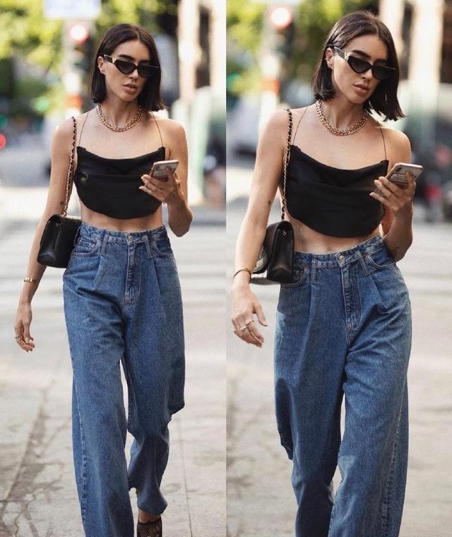 阔腿裤也是很不错的选择,但腰间的位置稍微紧实一些,向下胯部位置上的库管已经稍微肥一些了,这样就不会让胯骨的位置过于明显。上面的小姐姐就选择了一件蓝色的牛仔阔腿裤来搭配,阔腿裤比较宽松的版型,可以更好地这点儿胯部的位置,也可以让整个造型看上去更随性很多,上面只是搭配了一件黑色的吊带抹胸背心,腰间的位置完全露出来,让它看上去可以更显高很多。