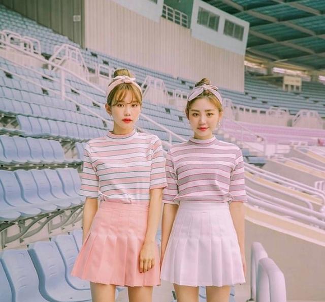 A字裙也是一种很不错的选择,这次的两位小姐姐同样选择了A字裙来搭配,裙子上半部分是高腰的设计,在下半部分设计了褶皱的裙摆,然后造型看上去可以更时尚多元一些,上面的是直接搭配了条纹款式的长袖t恤,长袖t恤里面包含几种颜色,可以跟裙子的颜色呼应,让造型更完整,这样医生到选看上去不仅时尚,而且会有更好的显高效果。
