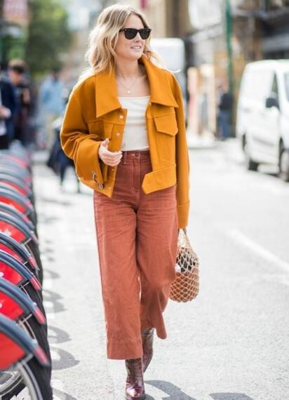 赶紧抛弃小黑裤,因为有灯芯绒阔腿裤的存在,让你在人群中脱颖而出。当橘红色灯芯绒阔腿裤,遇上棕黄毛呢外套,温度风度兼得,利落中带有一丝靓丽,尽显时尚高级气息,你准备好变美了吗?脚上搭配酒红色短靴,女人味十足,美得恰到好处,你学会了吗?