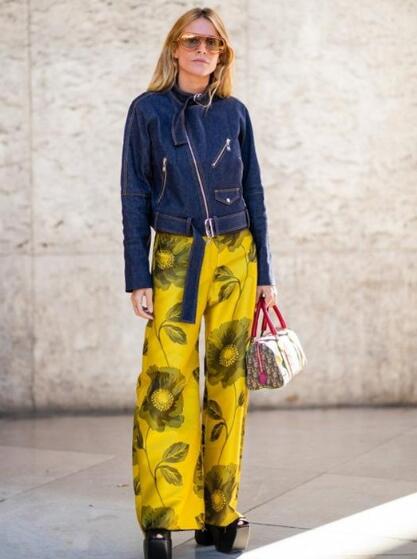 秋冬季是最需要亮眼的单品来增色,养眼又吸睛。当黄色印花阔腿裤,遇上牛仔外套,彰显十足个性,想不抢眼都很难,打造率性活力范,你准备好变美了吗?脚上搭配黑色坡跟鞋,让你分分钟拥有大长腿既视感,气场十足!