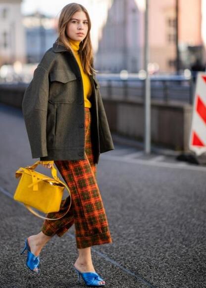 想要英伦风气息,也不想失去复古气息,那该怎么办呢?不要着急,因为有格纹阔腿裤的存在,轻轻松松hold住全场。当格纹阔腿裤,遇上黄色高领毛衣,帅气中带有一丝慵懒感,想不抢眼都很难。外搭灰色外套,精简又知性,尽显优雅女人味,等你来pick哟!脚上踩着蓝色小高跟,更是锦上添花,回头率up!