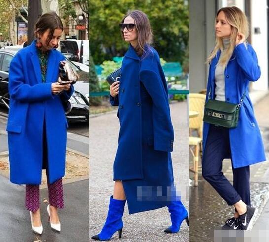老实说,宝石蓝这个颜色的单品不常见,因为它的颜色比较鲜艳,作为宝石蓝色的大衣就更加多人眼球了,因为搭配的面积比较大。但是在春季的时候穿真的很醒目,而且又自带贵族感,有它独特的时尚度在。选择颜色艳丽的单品,我觉得第一要选的是它的材质,要够高档,要不就会显得比较低档了,第二是选择版型,修身或者宽松看你自己的喜好了,如果想更特别一点的造型,可以像中间的街拍达人一样,估计扣错纽扣,制造不对称感,时髦度爆分!