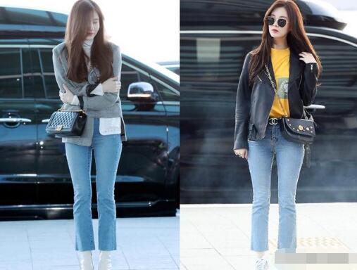 在女神徐贤的穿搭中,最常见的莫过于牛仔裤了,九分的牛仔裤无论是搭配上西装外套或者短皮衣,都是一种极为简单时髦的通勤造型,女装搭配。这样的搭配上班和日常生活中穿都完全没有问题。