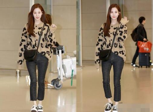 除了露肩,徐贤最近还有一身开衫毛衣+牛仔裤的休闲穿搭,豹纹的开衫毛衣搭配九分直筒牛仔裤,鞋子选择了青春经典的蓝色帆布鞋,这衣身穿搭也是简单不失潮流。