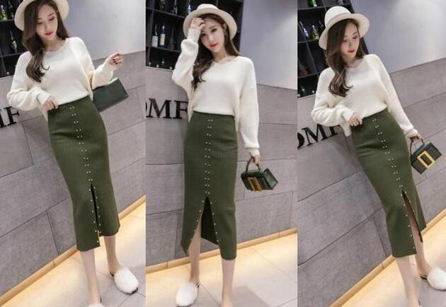 在春天,针织面料打造的开叉裙可是圈粉无数,如果你也是深爱这种裙子的菇凉,那么这一身穿搭不妨借鉴下,橄榄绿针织开叉裙,在颜色上,这种颜色的裙子还是比较特别的,穿衣技巧,裙子中间一排珍珠装饰,很好为裙子提升了时髦气息,包臀修身的设计,将女生姣好的身姿呈现,选择一件米白色毛衣搭配,更美了!