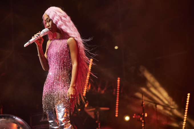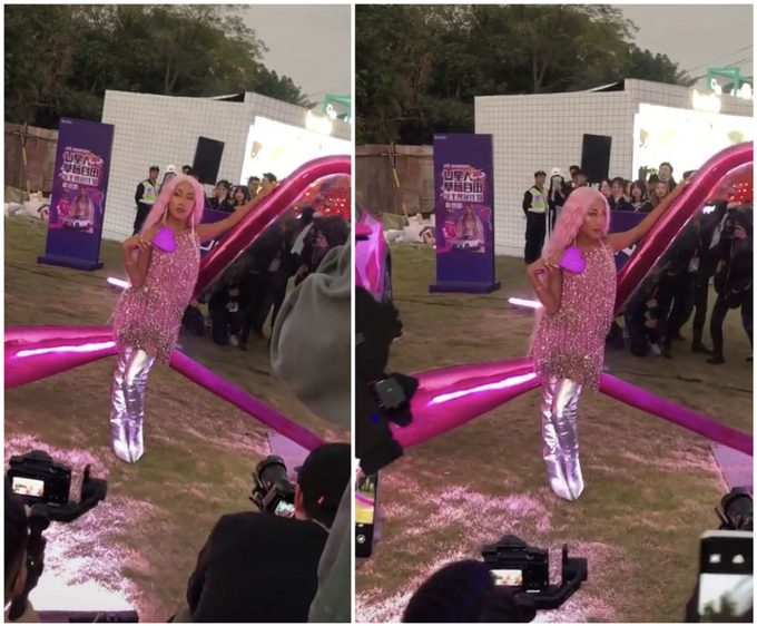 粉色流苏裙下面是银色长筒靴,长筒靴一直大腿,和亮片裙完美衔接,虽然没有露出大腿,但双腿看起来依旧很纤细。耳饰也是银色,和长筒靴相呼应,耳饰非常长,让人无法忽视,指甲也是银色亮片系。银色亮片和粉色亮片搭配在一起甜美又高级,将粉色衬得一点都俗气了,吉克隽逸虽然肤色黑,但五官精致立体,是黑皮肤的大美人。