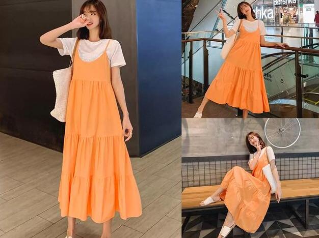 2、珊瑚橙色设计的吊带裙,属于是宽松版型的设计,对于身材微胖的女生来说,这也是很显瘦的一款裙子,吊带的设计,比较保守的女生最好是内搭一件t恤,这样穿上就很百搭了,而且还可以穿出层次感。